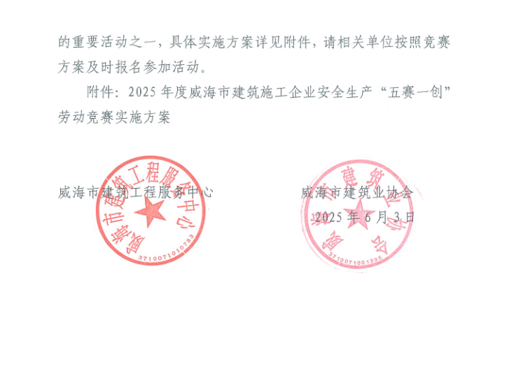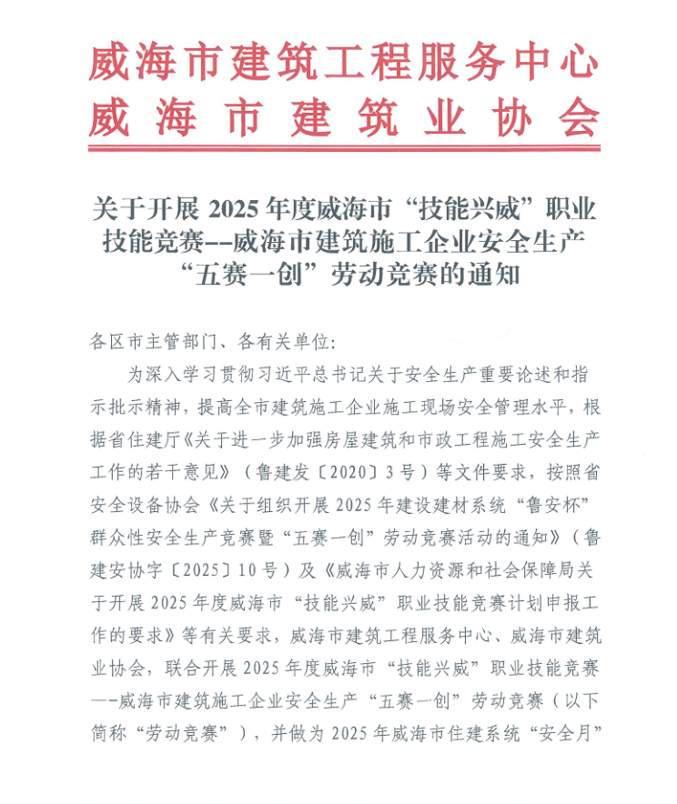 >關(guān)于開展2025年度威海市“技能興威”職業(yè)技能競賽--威海市建筑施工企業(yè)安全生產(chǎn)“五賽一創(chuàng)”勞動競賽的通知