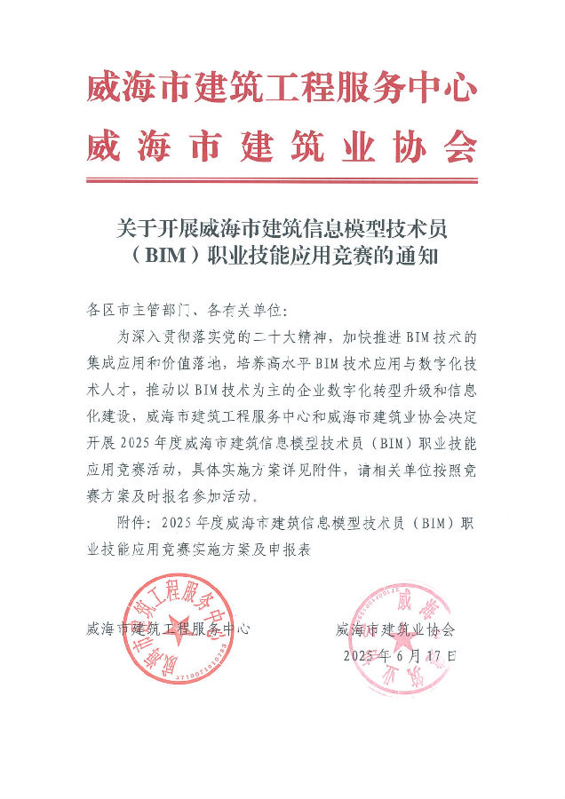 >關(guān)于開展威海市建筑信息模型技術(shù)員(BIM)職業(yè)技能應(yīng)用競(jìng)賽的通知